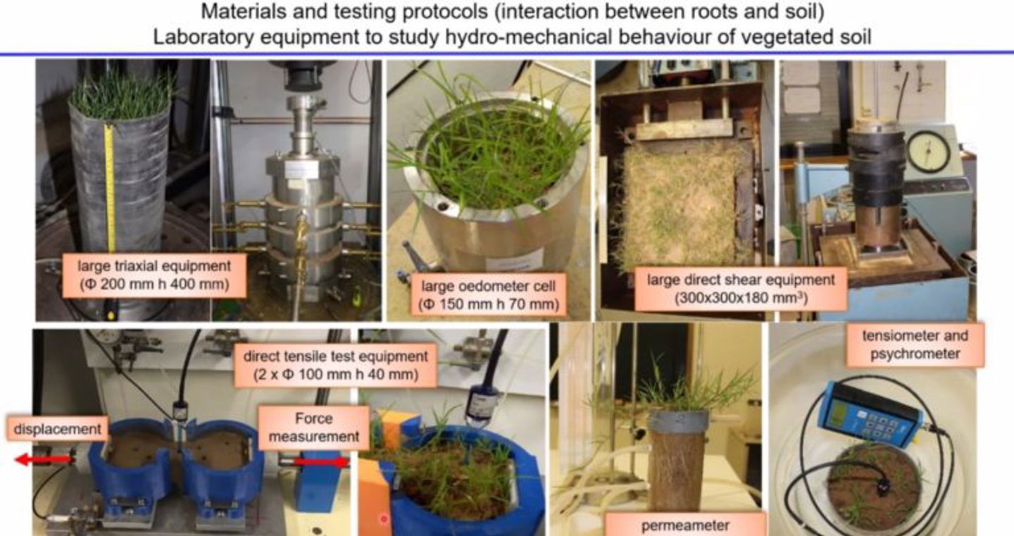 Example of laboratory testing equipment used at UPC to quantify the effects of roots on the hydro-mechanical properties of soils (from PhD thesis of Dr. Alessandro Fraccica, presentation by prof. Enrique Romero).