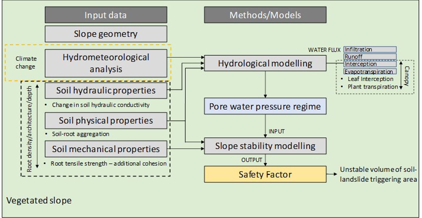 Methodological approach for slope stability modeling including vegetation–soil parameters and processes influenced by the presence of vegetation (root density/architecture/depth and canopy area).